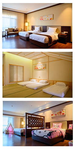 酒店總建筑面積30000多平方米,主樓高6層,設(shè)有150余間標(biāo)準(zhǔn)客房、家庭客房、日式客房和別墅客房。房內(nèi)設(shè)計(jì)新穎別致,充分考慮家庭度假需求,最小房型面積在50平米以上。